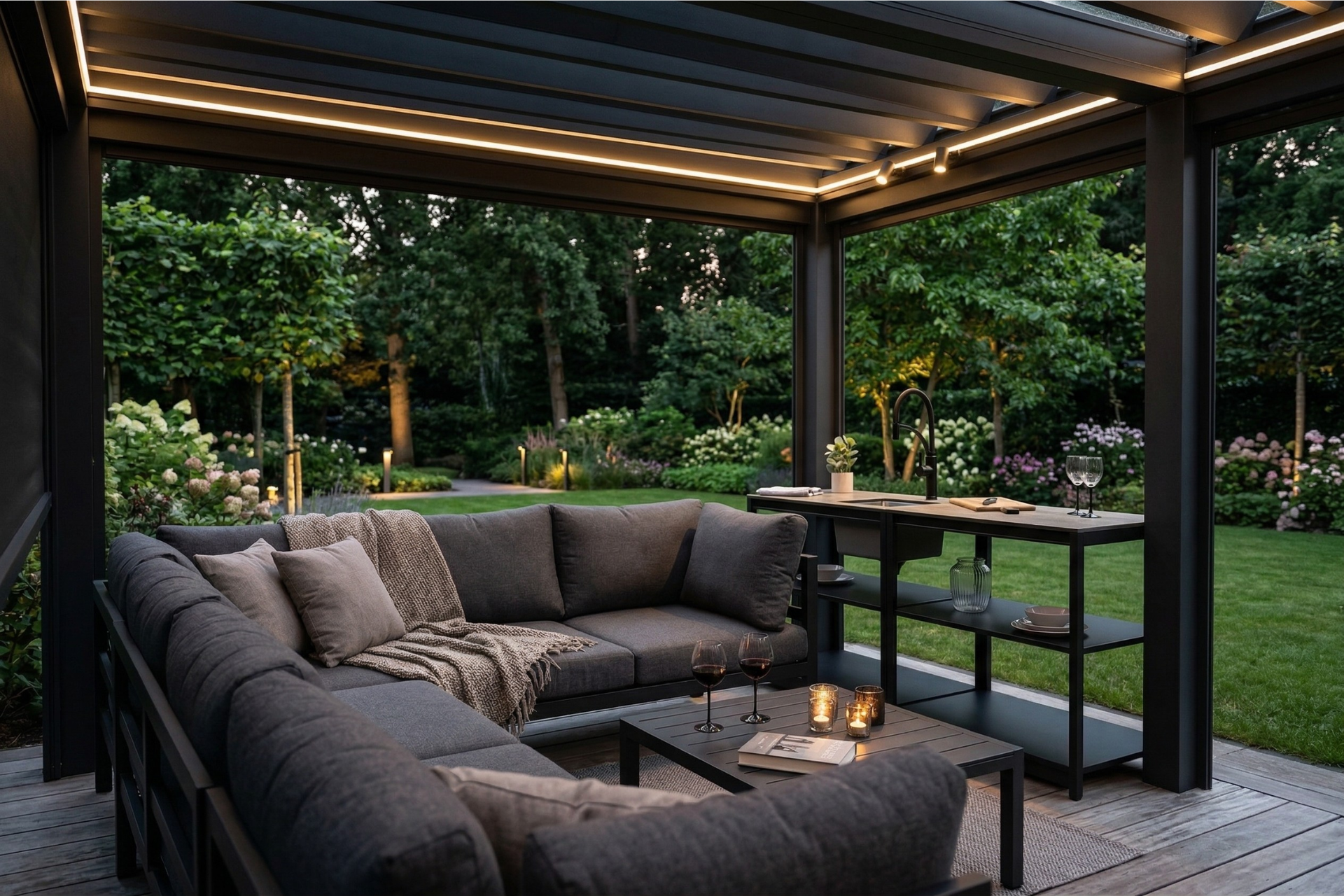Алюминий — идеален для открытых террас: он легкий, не подвержен коррозии и прост в перемещении. Каркас из алюминия (как в модульных кухнях Cronon) — это основательность и максимальная устойчивость к нагрузкам. Материал не требуют ежегодной покраски или сложного ухода, в отличие от дерева.