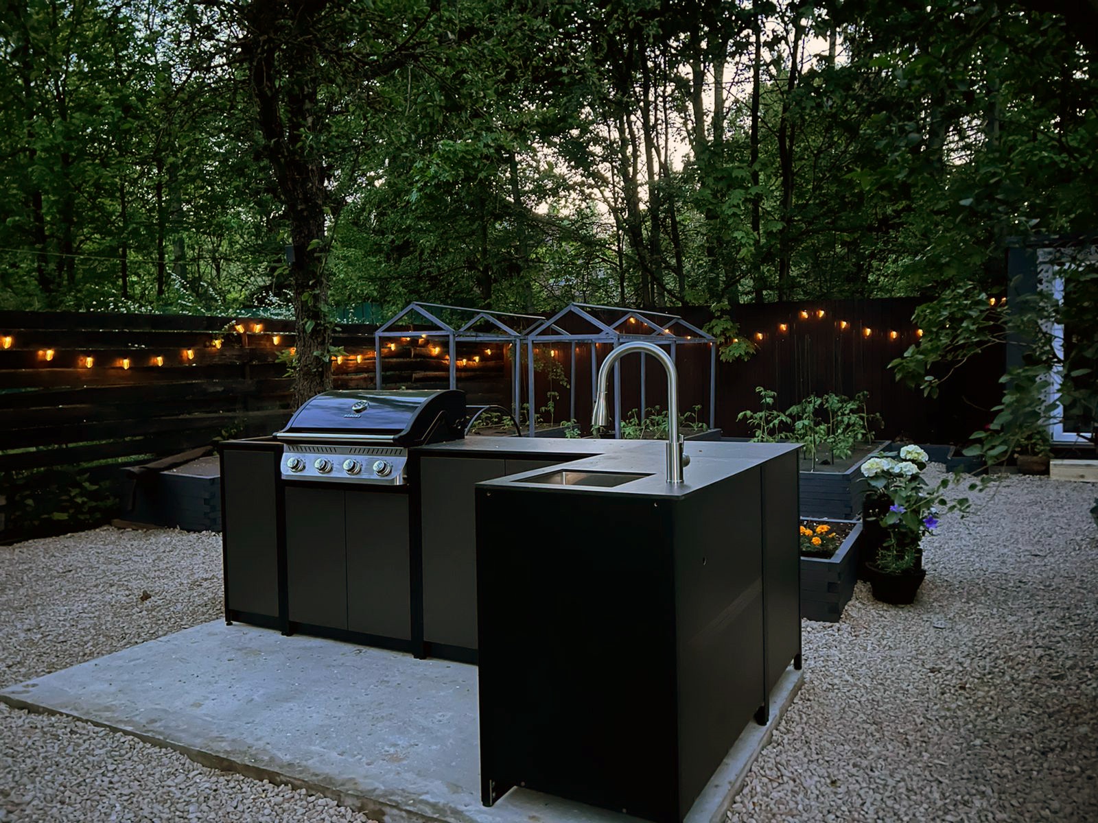 Чтобы зона получилась не только функциональной, но и красивой, важно выбрать правильные материалы. Наиболее привлекательным решением для оформления уличной кухни с зоной барбекю является алюминий в сочетании с влагостойким HPL. Подобное сочетание предотвращает появление коррозии, устойчиво к обилию влаги и прямого воздействия солнечного света. Более того, конструкция такого типа не деформируется в процессе механического воздействия и прекрасно выглядит в течение всего срока службы. Мыть и обслуживать такую зону очень просто.